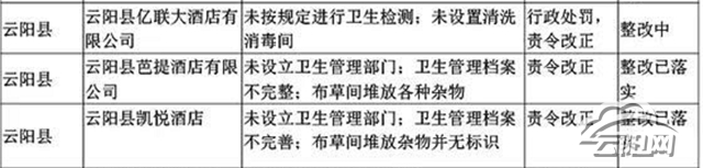 在本次检查中,我县有3家宾馆被责令整改,分别是亿联大酒店、芭提假日酒店、凯悦酒店,存在未设立卫生管理部门、卫生管理档案不完善等问题。目前,除了亿联大酒店还在整改中,另外两家酒店整改都已落实。