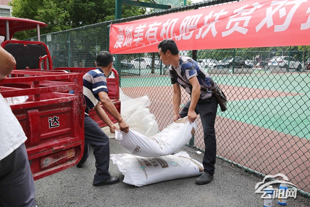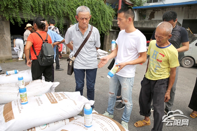 发放肥料时,13户离场镇较近的贫困户代表一一接过工作人员派发的肥料,每户3袋有机肥1瓶叶面配方肥,其余73户贫困户的肥料由村干部统一领取回村。工作人员还为在场贫困户详细地讲解肥料的使用步骤和方法、农作物病虫害防治等科普知识。