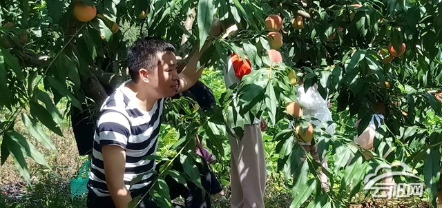 走到桃园的另一角,挂满枝头的黄桃映入眼帘,知了一个劲地嘶鸣,蜜蜂嗡嗡地从眼前飞过,仿佛在庆祝桃园的丰收。