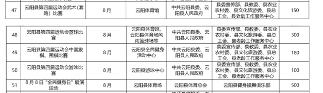 据介绍,八月将开展的体育赛事主要有云阳县第四届运动会、8月8日“全民健身日”展演活动。其中,云阳县第四届运动会将举办四项赛事,包括武术(套路)比赛、篮球比赛、象棋比赛、围棋比赛、游泳比赛,届时我县的运动健儿们将在赛场上向好成绩发起挑战。