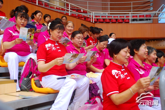 在县体育馆内,县老年人体育协会进行了展演,表演者们汇聚一起,在音乐的带动下,他们时而舒展身体,时而展臂开弓,时而收腹呼吸,脚步轻盈,神态舒缓。紧接着,一群青少年手持刀剑、棍棒、长枪等道具,出拳踢腿,一招一式打得有板有眼,精神奕奕。此外,柔力球、扇子武术等健身项目也轮番上阵,精彩纷呈。同时,县第四届运动会“体彩杯”武术比赛的选手们也在场内进行积极备战,比赛分为老年组、青少年组,包含了太极拳、太极剑、刀术、棍术以及枪法等内容。选手们个个精神抖擞,完美呈现自己的武术表演,现场教练对他们进行了指导训练。活动现场还发放了《重庆市全民健身条例》宣传手册。