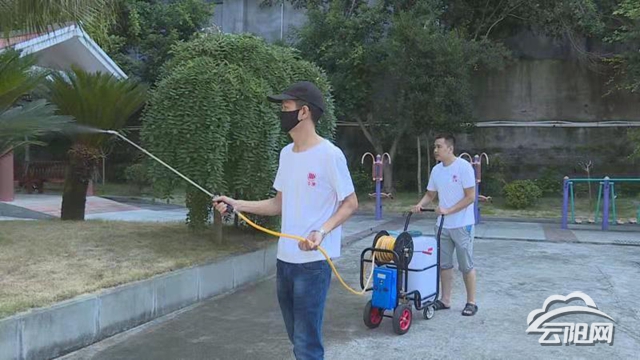 志愿者们来到县城乡社会福利院,对树木草丛中、院内容易滋生蚊虫的地方喷洒了灭虫药物,并在老人房间、食堂等区域放置了灭鼠药物。