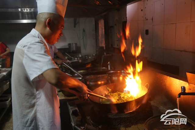 负责炒菜的吴师傅左手握住炒锅,右手拿着勺子,不断地翻炒,一道小炒还没烧好,吴师傅的脸就被熏红了,厨师帽帽檐边的发丝也被汗水浸湿,紧贴在额头上,白色的制服也被汗湿。火吱吱的燃烧,散发出令人难以靠近的温度。“现在厨房的温度在60度左右,如果所有的灶在火力全开的情况下,温度会更高。”吴大厨告诉记者,6月至8月是最难熬的日子,上班期间衣服从没有干过,汗水进入眼睛是常有的事。当我们走到室外,在40℃的高温下感觉到的也是凉爽。