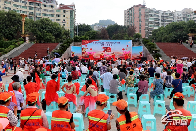 云阳网讯(实习生 刘超)9月10日,由青龙街道主办,青龙嘴社区、县经信委等单位联合承办的庆祝中华人民共和国成立七十周年中秋文娱演出在群益广场举行,辖区干部群众欢聚一堂,向祖国70华诞献礼。