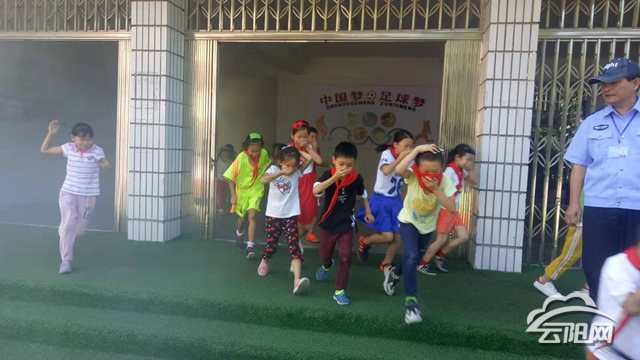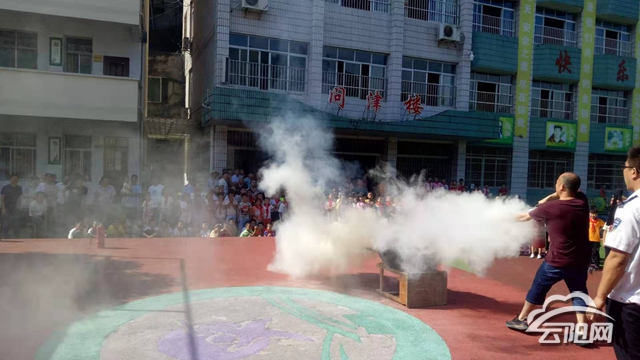 在消防应急疏散演练活动中,学校在安全处放上对人体无害的烟雾弹,模拟学校某处发生初期火灾,学校老师组织学生疏散逃生并扑灭“火灾”的场景。在老师的带领下,学生们捂住口鼻,低头弯腰,井然有序的撤离至安全区域。