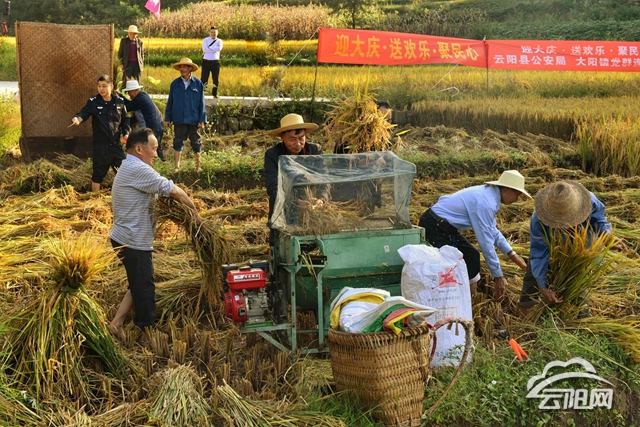 9月的大阳,田野里遍地金黄,到处洋溢着丰收的喜悦。活动现场,党员干部民警与群众分工合作,有的拿着镰刀弯腰割稻穗,有的在田间来回奔走传递稻穗,有的脚踏打谷机,将稻穗放进机器内脱粒,有的将打谷机后仓的谷子装到袋子里。个个争先恐后,割稻子,打稻谷,田间一派繁忙的丰收景象。
