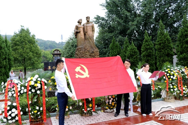 在彭咏梧、江竹筠烈士纪念碑前,乡主要负责人向大家讲解革命英雄事迹,全体党员为烈士深深默哀,并依次敬献花篮。面对鲜红的党旗,大家举起右手,饱含深情,重温入党誓词,接受精神洗礼。