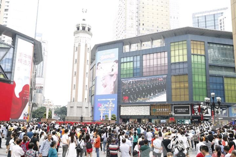 • 渝中区解放碑大屏幕前面有不少人观看阅兵式。华龙网-新重庆客户端 首席记者 李文科 摄