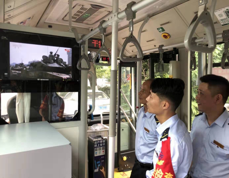 在公交121路起点站,驾驶员们在车厢内观看阅兵式。通讯员 罗增延 摄