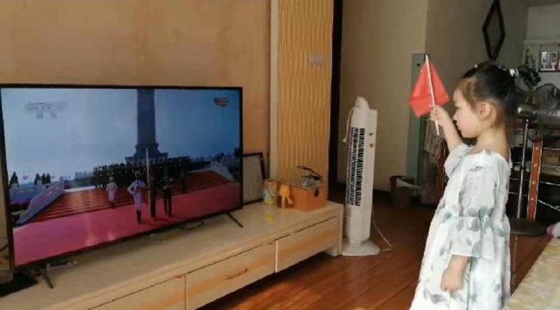 大竹林街道凤栖沱社区居民陈翔家,一家人一大早就打开了电视收看直播。在观看过程中,陈翔化身解说员,每播出一个新环节,陈翔都仔细向女儿李心怡解说。随着直播乐曲,李心怡还跳起了舞。陈翔说,这次收看阅兵式和群众游行直播,是一次难得的爱国主义教育,她要和女儿一起好好学习,从小培养孩子的爱国热情:“祝福祖国繁荣富强,越来越好。”