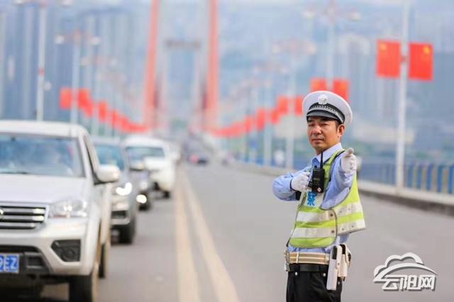 云阳网讯(通讯员 谭舰)国庆期间,云阳长江大桥南桥头,交巡在有序指挥交通。
