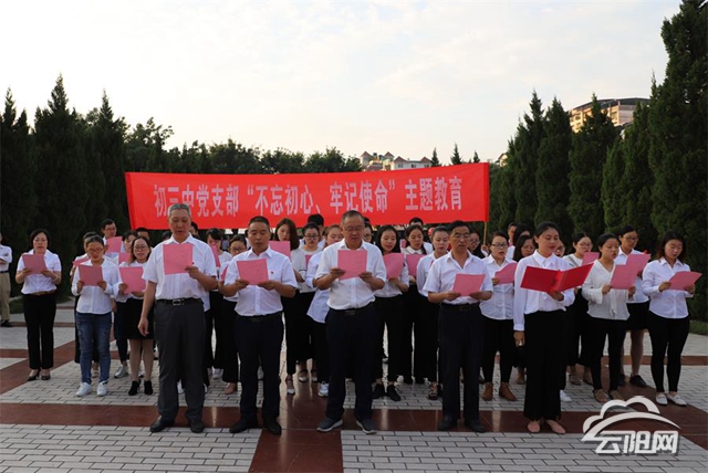 初三中党支部负责人带领全体党员重温入党誓词,并要求全体党员铭记先烈丰功伟绩,发扬不怕吃苦、艰苦奋斗的革命精神。在新时代,勇担责任,牢记使命;立足本职,扎实工作;乐观向上,热爱生活。