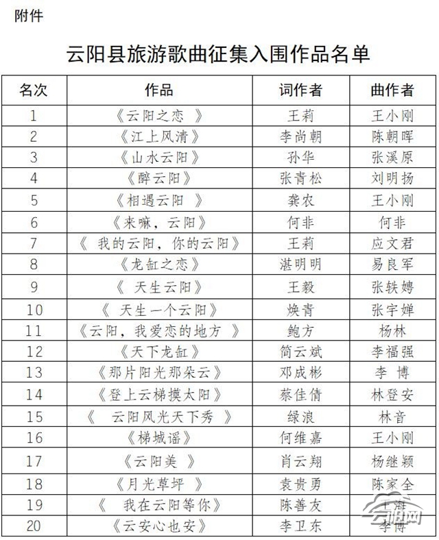 云阳网讯(记者 郑红均)日前,由云阳县文旅委、县文联主办的“万里长江·天生云阳”旅游歌曲征集大赛活动排名出炉,其中由王莉作词、王小刚作曲的《云阳之恋》荣获金奖。