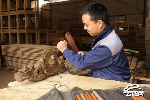 在高阳镇工业园区的一家具厂内,木雕师傅刘康财拿着传统的刻刀,聚精会神地雕刻着每一件作品。