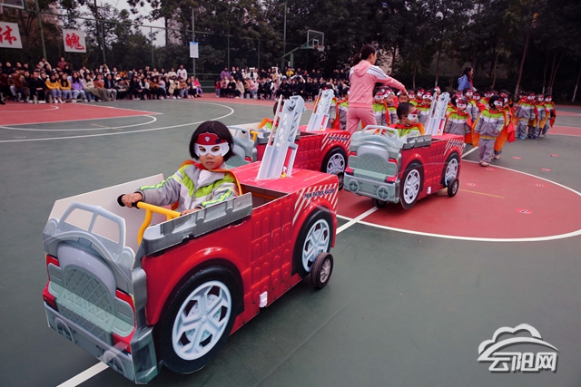 在入场式上,小一班的幼儿扮演着小小消防员毛毛,在3台消防车的带领下,排着整齐的队伍,迈着矫健的步伐,进入运动场,高喊“我,火力全开!”小二班扮演着汪汪队中灰灰,他们披着绿色的披风,代表着绿色和环保,他们的特点是擅长维修和回收,高呼“别丢掉,再利用!”在绿色环保车的带领下走过主席台;小三班、小四班分别扮演汪汪队中阿奇和小砾,经过主席台,接受检阅。在运动会上,他们都成为一道道靓丽的风景……