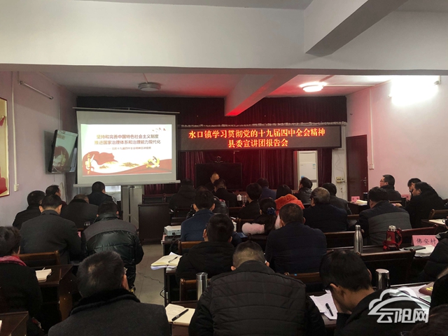 • 云阳网讯(通讯员 邓光宏)12月10日,根据县委统一安排,县委宣讲团党的十九届四中全会精神宣讲报告会在水口举行。