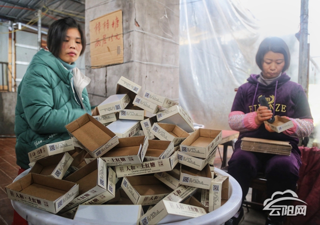 为激发群众就业创业积极性,人和街道民权村厚云甘蔗专业种植合作社组织当地留守妇女在红糖制作厂务工,帮助她们在家门口就业增收。每名务工留守妇女每天可赚150元。图为留守妇女正在制作红糖包装盒。(何竞嘉 摄)