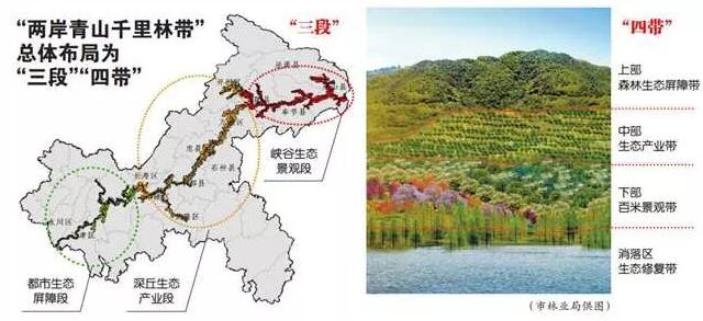 “两岸青山千里林带”总体布局为“三段”“四带”。其中,“三段”具体是:峡谷生态景观段(包括云阳、奉节、巫山、巫溪4个县),结合生态旅游重点打造三峡红叶景观与脆李、脐橙等生态林;深丘生态产业段(包括长寿、涪陵、武隆、丰都、忠县、石柱、万州、开州8个区县),结合生态产业重点布局柑橘、笋竹等特色经果林,兼顾生态景观林打造;都市生态屏障段(包括永川、江津、巴南、大渡口、九龙坡、南岸、江北、北碚、沙坪坝、渝北10个区),结合城镇污染防控措施重点提升城市生态屏障功能,兼顾景观品质与特色经果林发展。