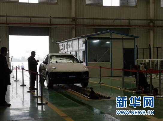 一辆保时捷越野车在重庆整车进口口岸检测线上接受检测。新华网 王龙博 摄