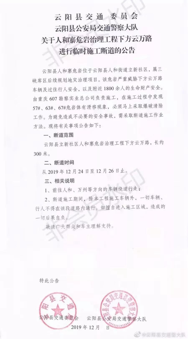 2019年12月24日至12月26日止,云阳县立新社区人和寨危岩治理工程下方云万路,长约300米路段将继续断道施工,断道期间除本工程施工车辆外,一切车辆、行人不得在该段道路内通行,请前往人和、万州等方向的车辆绕道行走,感谢广大群众和驾驶人理解和支持。