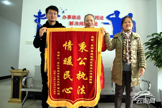 云阳网讯(记者 王彬彬)12月25日,家住双江街道的黄女士把一面写着“秉公执法 ,情暖民心”的锦旗送到了县违法建筑整治工作指挥部办公室,真诚地表达对县城市管理综合行政执法支队拆违队员的感谢之情。