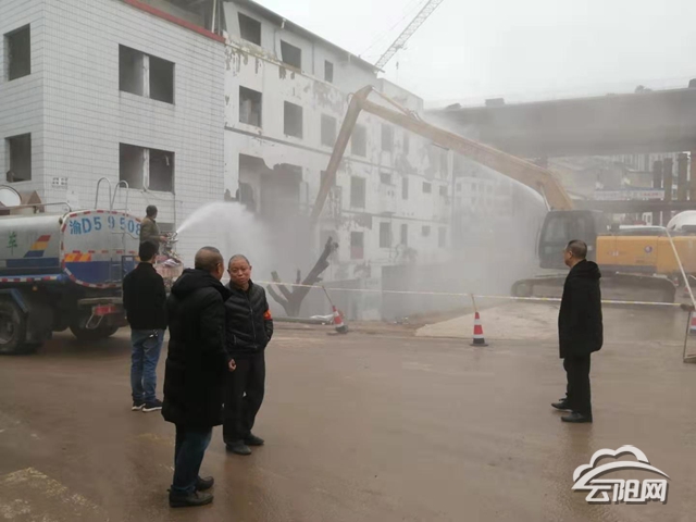据拆迁工作人员介绍,为减轻拆迁扬尘对云开路过往车辆和群众的影响,施工方特意安排了一辆洒水车洒水扑尘。