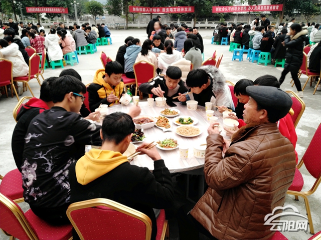 活动中,学校对优秀学生进行嘉奖表彰,颁发了“三好学生”“优秀班干部”“优秀寝室”等奖项,激励学生们在来年的学习与生活中自律自强,提升自我,追求卓越。表彰结束后,学校操场上摆“坝坝席”,全校师生一起吃了一顿团年饭,大家在饭桌上把酒言欢,共话对新一年的美好期望,师生和乐的氛围弥漫在校园中。作为重头戏的文艺晚会压轴登场,每个孩子都拿出自己的绝活,用美妙的歌声、动人的舞姿、精湛的表演展现他们青春活力。老师们也不甘落后,纷纷登台表演,相比于同时上课时的一丝不苟,他们此刻的活力四射让孩子们耳目一新,喝彩声、欢呼声此起彼伏,整个操场成立一片欢乐的海洋。