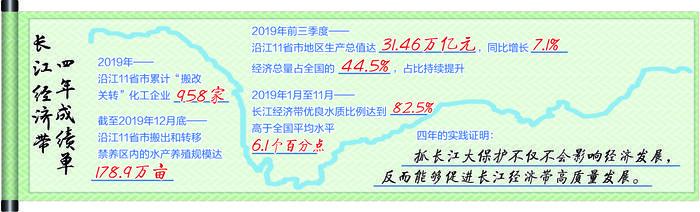 2019年前三季度,沿江11省市地区生产总值达31.46万亿元,同比增长7.1%,高于全国平均增速0.9个百分点,经济总量占全国的44.5%,占比持续提升。“这充分说明,抓长江大保护不仅不会影响经济发展,反而能够促进长江经济带高质量发展。”推动长江经济带发展领导小组办公室有关负责人说。