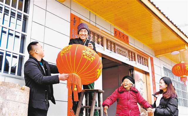 二○一九年十二月二十七日,酉阳车田乡清明村建卡贫困户张吉元喜迁新居,乡纪委工作人员和张吉元一起挂灯笼、贴对联,喜迎新年。 通讯员 杨春来 摄