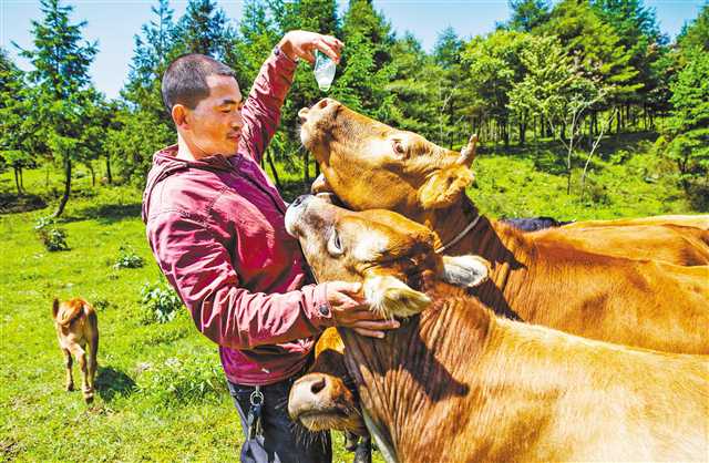 丰都县仙女湖镇轿子山草场,村民正在喂牛,肉牛养殖成丰都的重要产业。(本报资料图片)通讯员 陈勇 摄