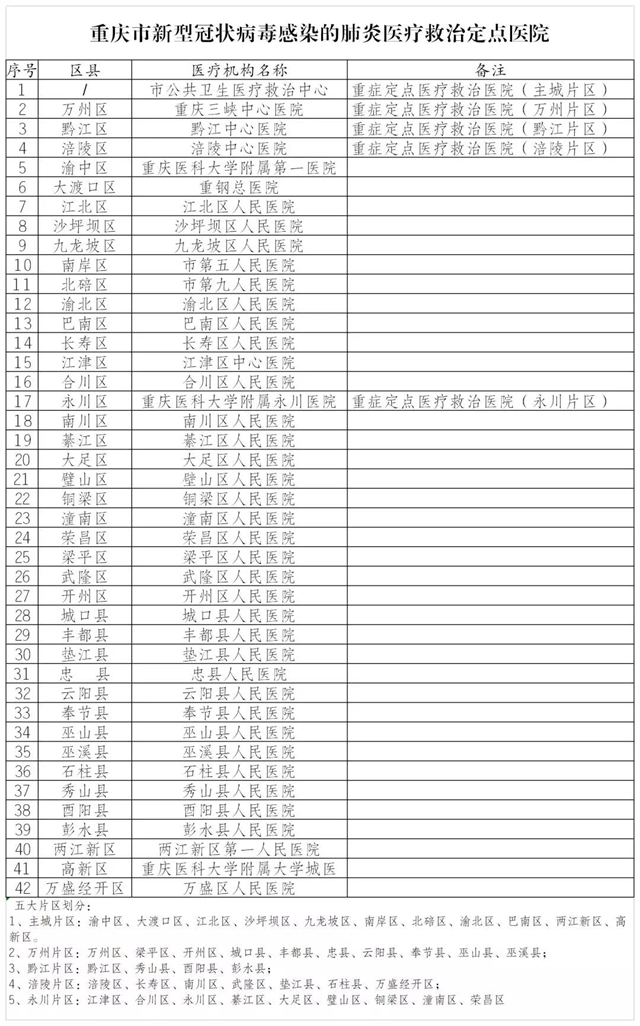 此前,重庆已公布42家新型冠状病毒感染的肺炎医疗救治定点医院。