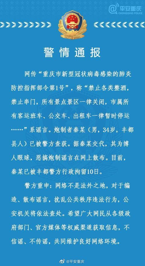 华龙网-新重庆客户端1月26日11时03分讯(首席记者 佘振芳)今(26)日,重庆警方发布警情通报,网传“重庆市新型冠状病毒感染的肺炎防控指挥部令第1号”,称“禁止各类整酒,禁止串门,所有景点景区一律关闭,市属所有客运班车、公交车、出租车一律暂时停运……”系谣言。炮制者秦某(男,34岁,丰都县人)已被警方查获。