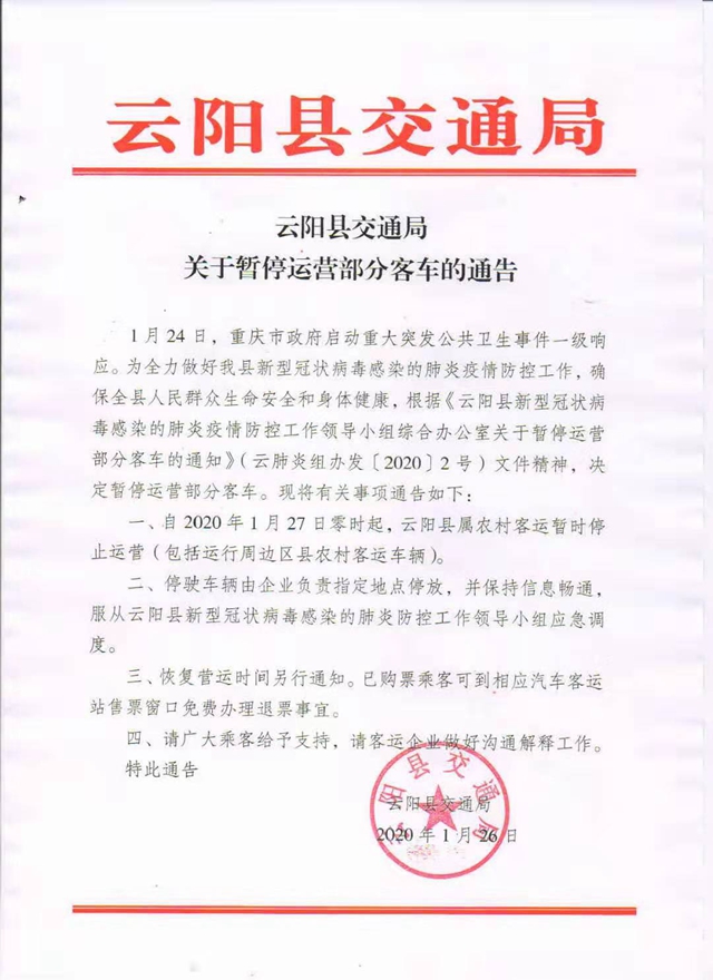 一、自2020年1月27日零时起,云阳县属农村客运暂时停止运营(包括运行周边区县农村客运车辆)。