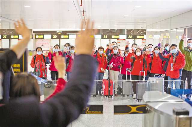 1月26日,重庆机场T3航站楼候机厅,重庆市市级医疗队成员与亲人、同事挥手告别,他们将奔赴湖北孝感支援一线救治工作。记者 谢智强 摄