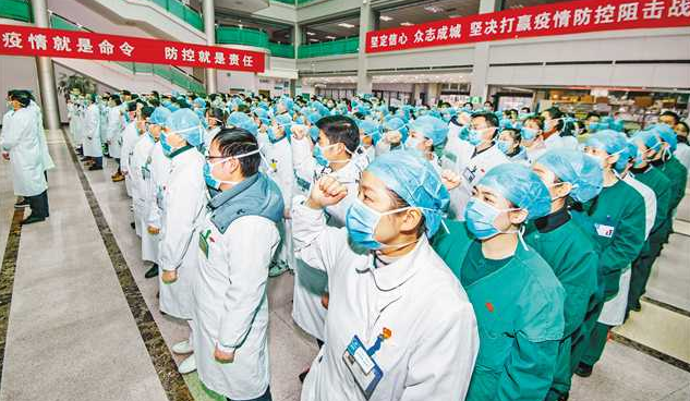 1月28日,重庆三峡中心医院抗击新型冠状病毒感染的肺炎誓师大会举行,200多名党员医务工作者誓言团结一致,冲锋在前,坚决打赢疫情防控阻击战。特约摄影 冉孟军
