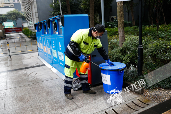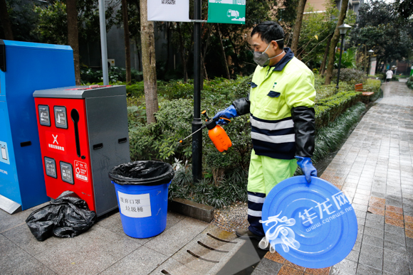 • 渝北区春风城市心筑小区,清洁工正在对口罩专用垃圾桶进行消毒。华龙网-新重庆客户端记者 石涛 摄
