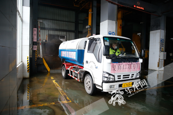 随后,这些废弃口罩则被垃圾车运往重庆固体废弃物运输有限公司北部流转中心城南站。华龙网-新重庆客户端记者了解到,目前市环卫集团在主城区有六辆专业的废弃口罩运输车,不仅是全密闭式并张贴明确标识,同时在进出各小区时也都要及时对车辆进行消毒杀菌。而运输车辆抵达二次转运站后,也将进行消杀后才能停放到指定的车位上,转运站将严格进行记录。据介绍,市环卫集团特别加强对废弃口罩专用车辆、容器的消杀工作,要求每天不少于两次。