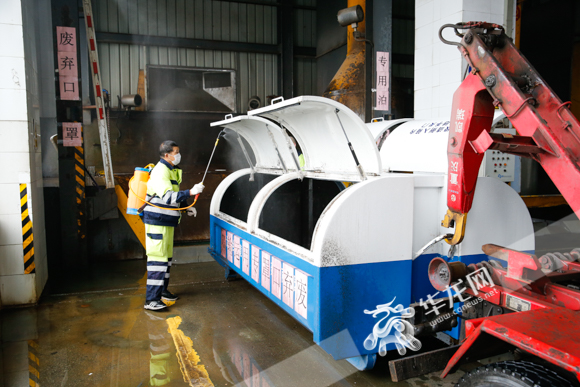 倾倒结束后,工人对垃圾箱进行消毒。华龙网-新重庆客户端记者 石涛 摄