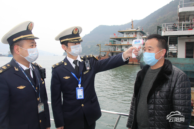 “我们云阳海事处现在的主要任务,是对停泊在盘石的待闸船舶进行防疫监控,每天我们都会对船员进行体温测量和防疫宣传,并督促船员做好船上的卫生消毒工作。”云阳海事处新城执法大队执法人员单斌说,“对于个别有需要的船舶,海事处会定期帮他们运送生活物资和免费发放口罩、消毒水等医护物资。”