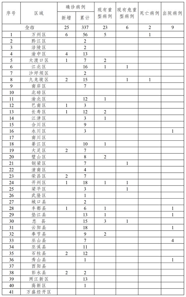 新增确诊病例中,万州区6例、渝中区4例、大渡口区1例、九龙坡区2例、巴南区1例、长寿区1例、大足区2例、荣昌区2例、开州区1例、丰都县1例、石柱县2例、彭水县2例;新增出院病例为巫山县1例。
