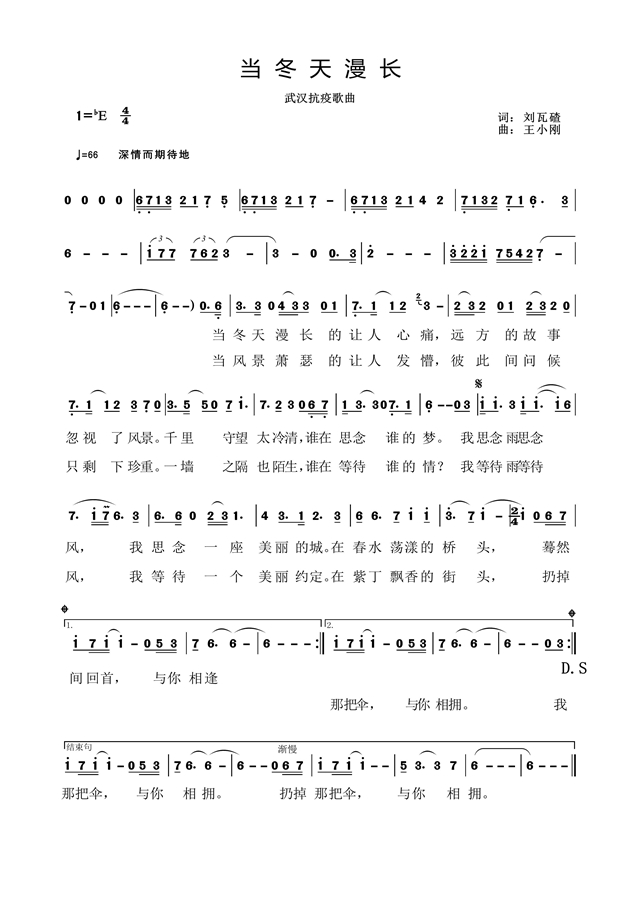 “当冬天漫长得让人心痛,远方的故事忽视了风景……我思念雨思念风,我思念一座美丽的城,在春水荡漾的桥头,蓦然回首,与你相逢……”歌词所描述的不单单是一个人的思念、一个人的等待,也是万众的思念、万众的等待,曲调深沉、壮阔,扣人心弦,激励人们众志成城,携手打赢这场疫情防控阻击战。