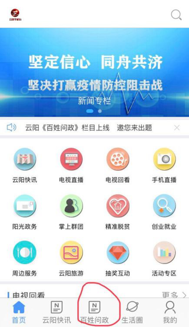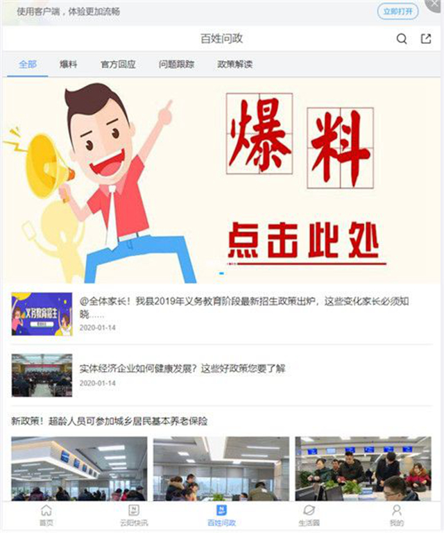 2、打开云阳手机台,点击首页下方“百姓问政”,再点曝料,拍摄或填写上传即可。