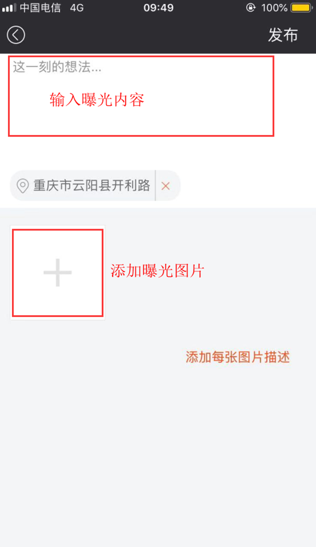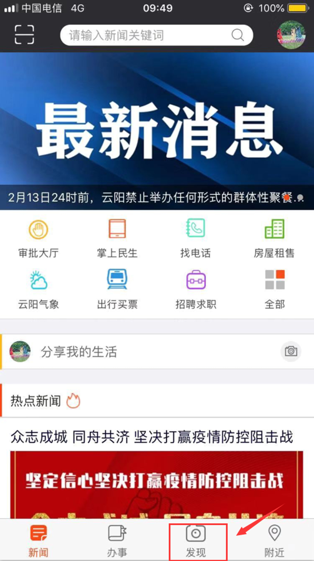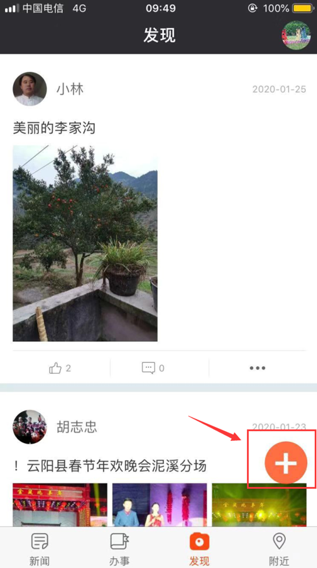 1、打开智慧云阳APP,点击首页下方“发现”,再点击页面右下方的“+”,进入拍摄或填写上传即可。