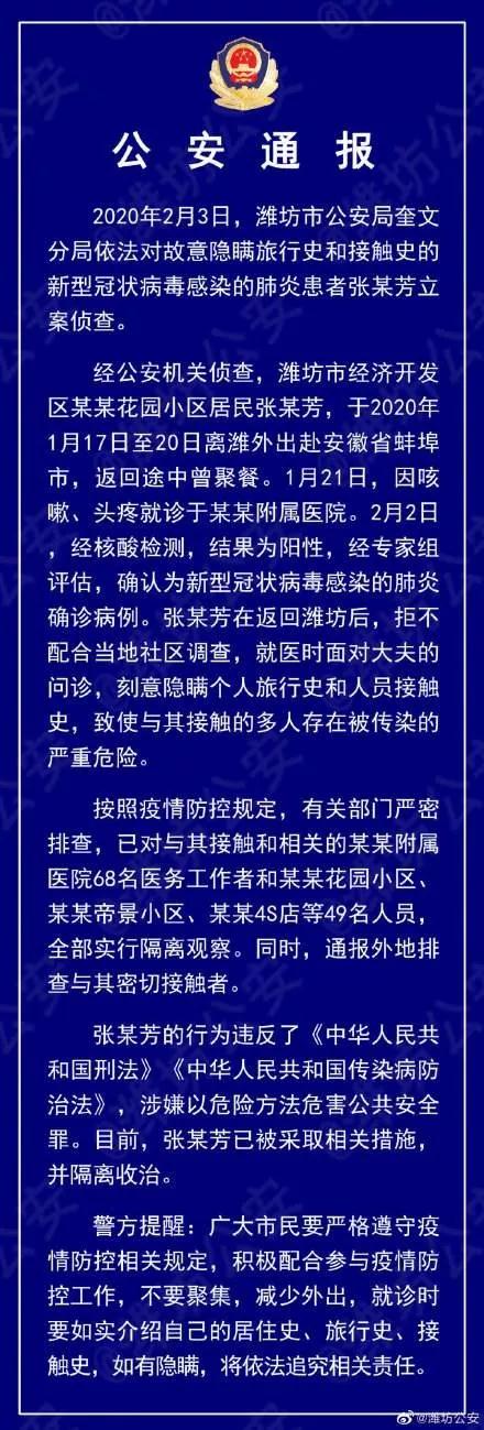 • 2月5日,山东潍坊市公安机关发布通报称,2020年2月3日,潍坊市公安局奎文分局依法对故意隐瞒旅行史和接触史的新型冠状病毒感染的肺炎患者张某芳立案侦查。