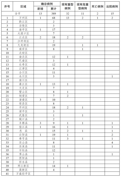 新增确诊病例中,万州区1例、渝中区1例、江北区2例、綦江区1例、潼南区3例、丰都县3例、垫江县1例、云阳县1例;新增重型病例中,万州区7例、忠县1例、两江新区1例;重型病例转普通型病例中,綦江区1例、两江新区1例;重型病例转危重型病例中,武隆区1例、奉节县1例;危重型病例转重型病例为铜梁区1例;新增出院病例为万州区1例。