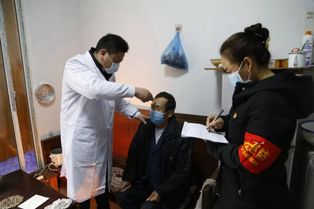 此时,在社区74岁的戴坤伦老人家中,志愿者准时上门宣传疫情防控知识,医护人员为他测体温,了解身体健康情况。面对大家的热心关怀,戴坤伦热泪盈眶,他说:“真是辛苦你们了,天天准时上门为我测体温,还给我提供口罩,我这道健康门就是靠你们守着的。临走时,志愿者反复叮嘱老人不要出门、不要串门,也不要让其他人来家串门。