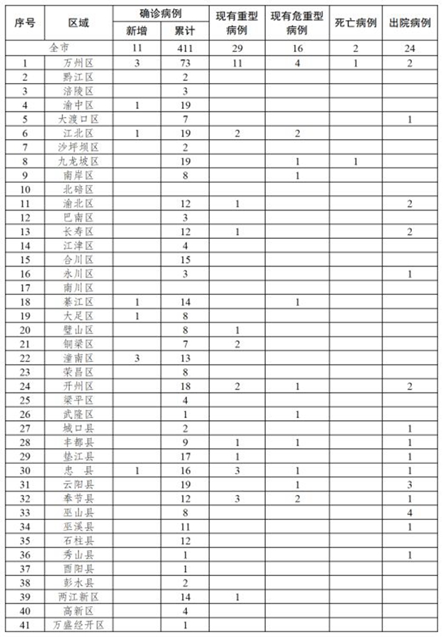 新增确诊病例中,万州区3例、渝中区1例、江北区1例、綦江区1例、大足区1例、潼南区3例、忠县1例;新增重型病例中,忠县1例、奉节县1例;重型病例转危重型病例中,万州区2例、綦江区1例、云阳县1例、奉节县1例;新增出院病例中,大渡口区1例、渝北区2例、长寿区2例、开州区2例、城口县1例、云阳县1例。