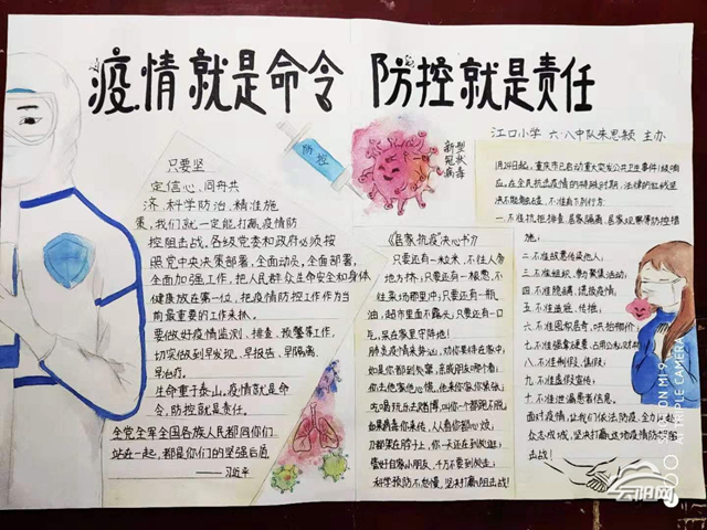 学校组织老师们通过班级QQ群、微信群等多种渠道,向学生和家长们宣传有关“新冠肺炎”的各种知识以及预防和应对措施。此外,学校还开展了“防控战‘疫’我先行”的征文比赛和手抄报比赛,并委派学生们作为家庭预防战线中的宣讲员和守门员,主动承担把守门关的重任,向家中的父母和老人发出预防倡议——“呆在家里就是对社会最大的贡献”。