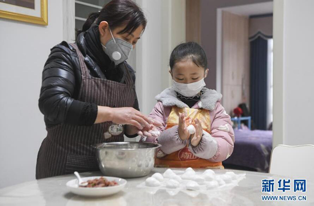 2月6日,重庆市云阳县海峡小学一年级学生周彦希在家人的指导下学习包汤圆。(新华社记者 王全超/摄)