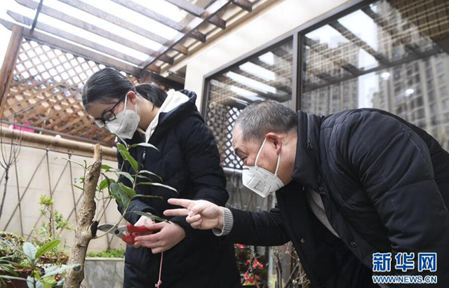 2月6日,重庆市云阳县第三初级中学一年级学生吴雨灿在爸爸的指导下给阳台上的盆景植物修枝。(新华社记者 王全超/摄)